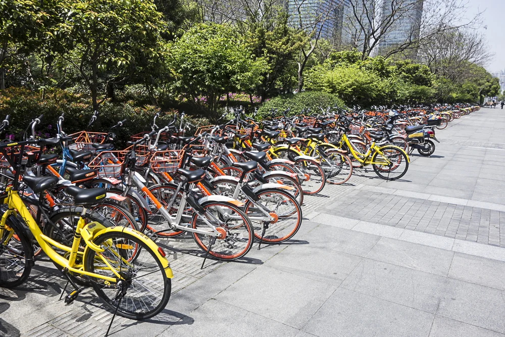 The scene each morning outside NYU-Shanghai with the two competing bike sharing companies Mobike (orange) and Ofo (yellow)