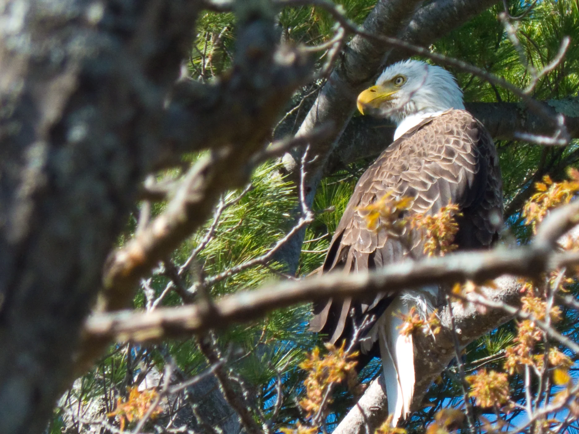 On our island the only notable inhabitants are a pair of nesting bald eagles who had a large nest on a tall pine tree the year that we bought it. They raised two eaglets that following spring and summer, but in the fall a large storm blew the nest down. However, the eagles stayed in the area in future years and built a nest on the mainland across from our island in the winter. They have successively raised eaglets every year except one, as far as we know. Of course this assumes they are the same birds, which we have no way of confirming. In the meantime we are learning a lot about eagles.