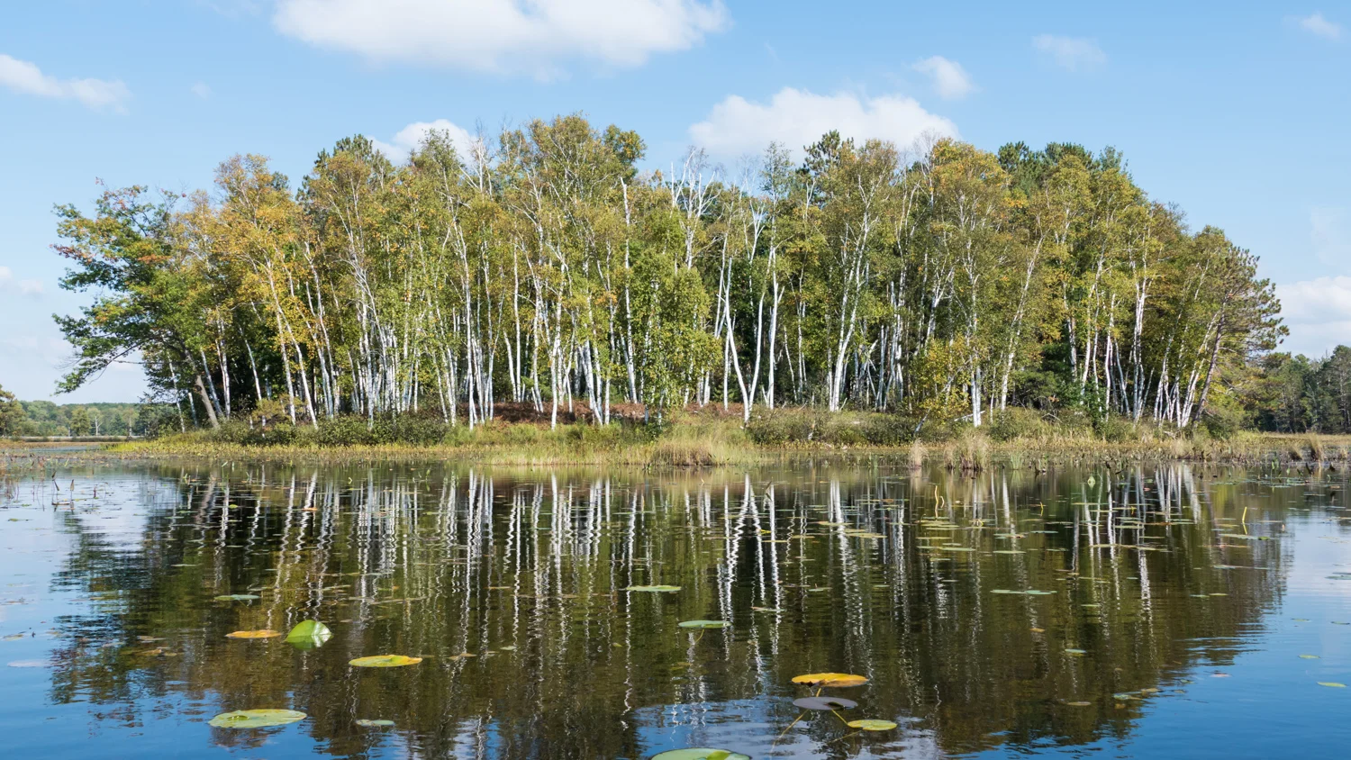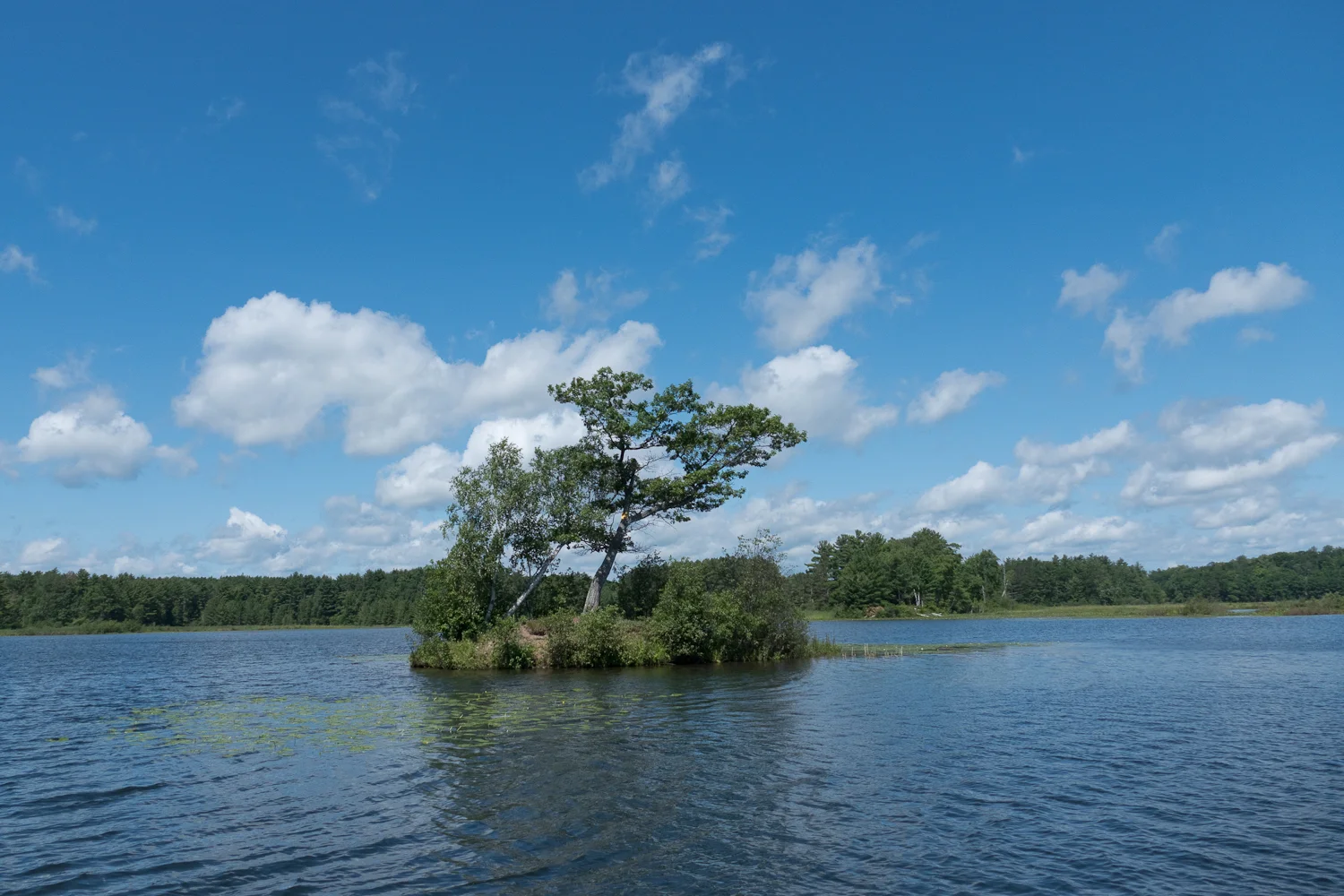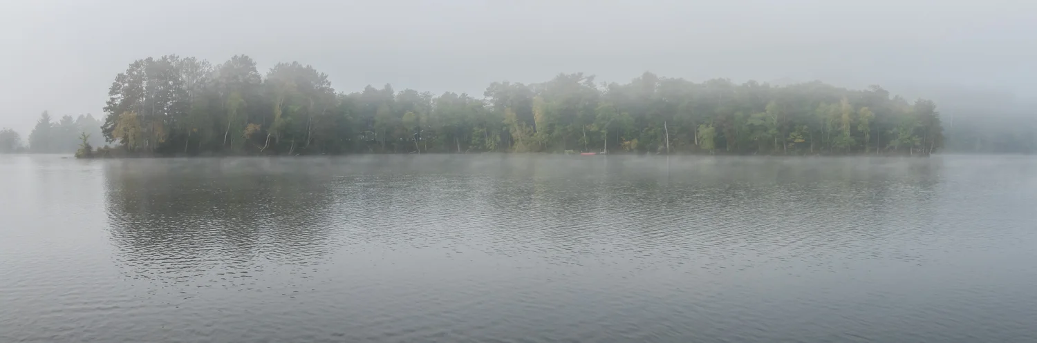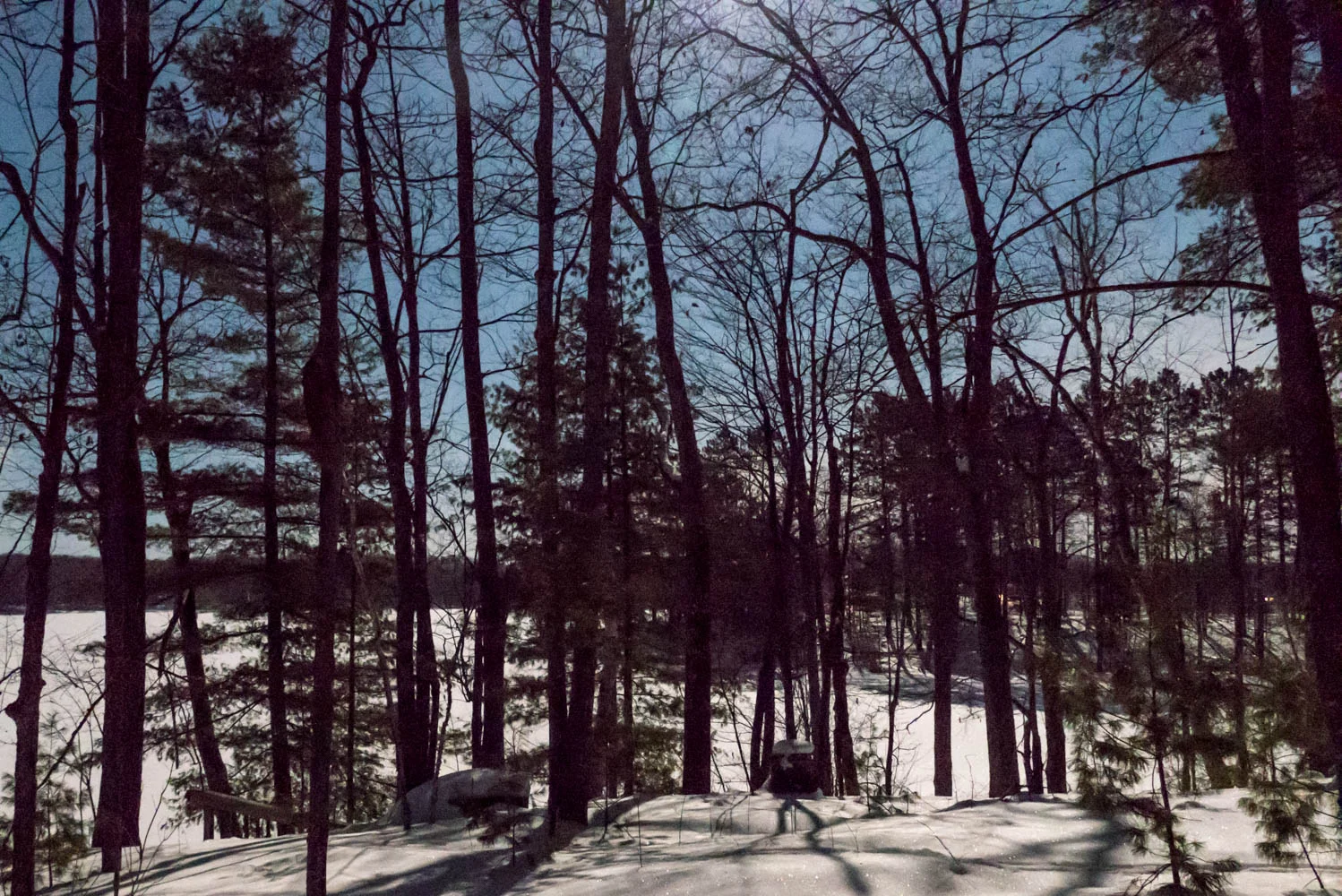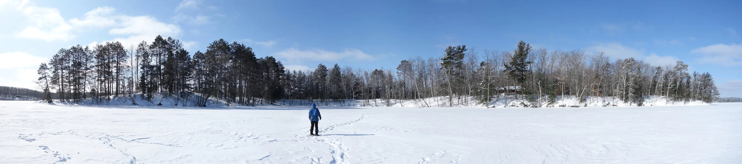 Panoramic view of the island from the north in the winter. The cabin is visible through the trees to the right of center