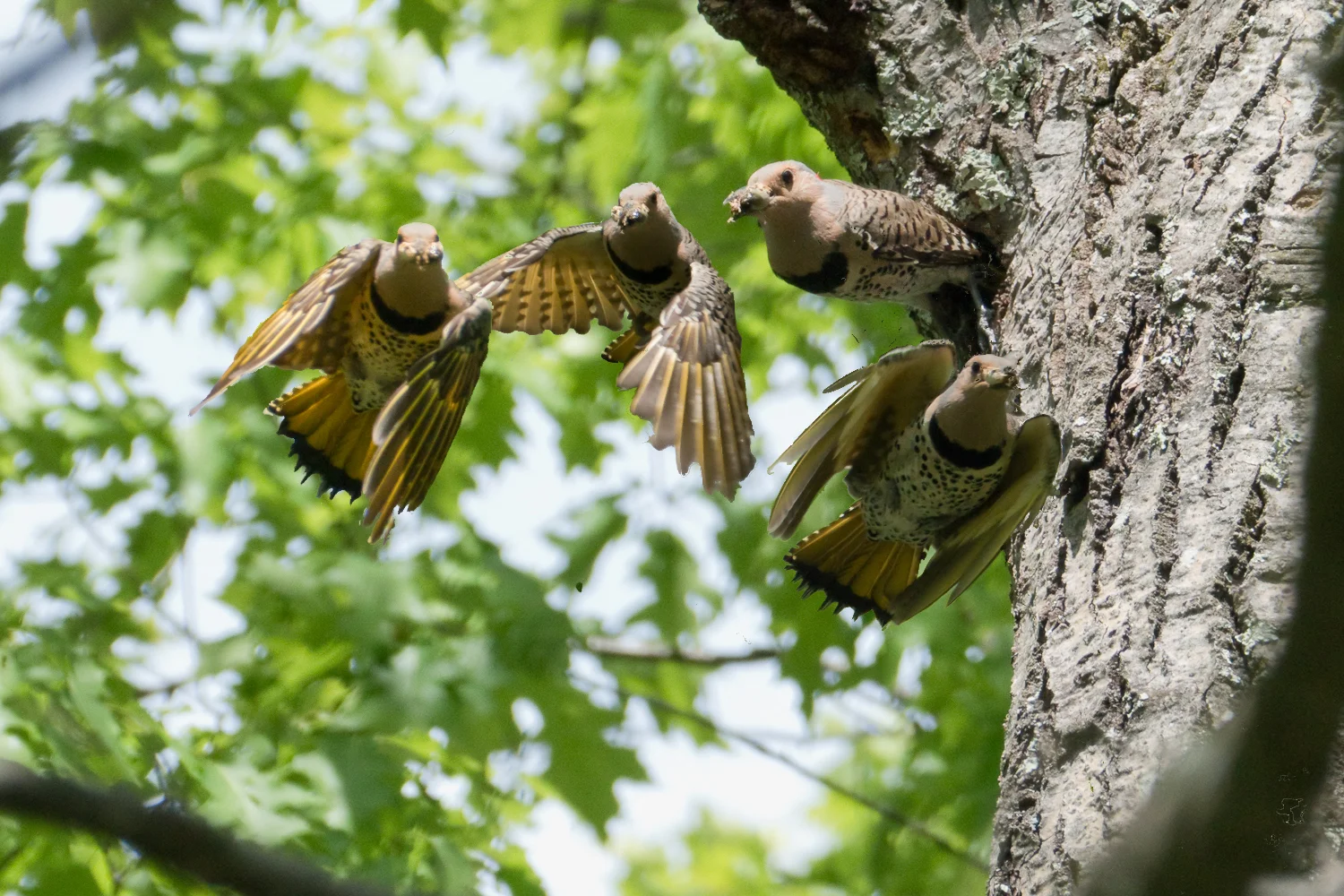 Sequence photo of the eaglet taking off from a branch at sunset.