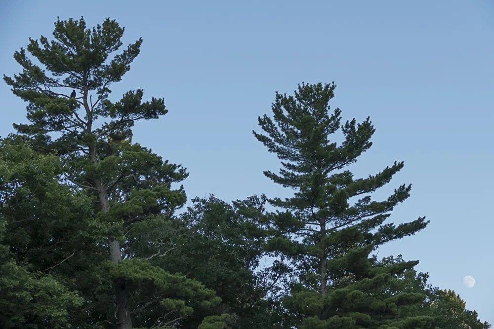 The eaglet is on the pine tree on the left and the nearly full moon is rising slowly at the far right.