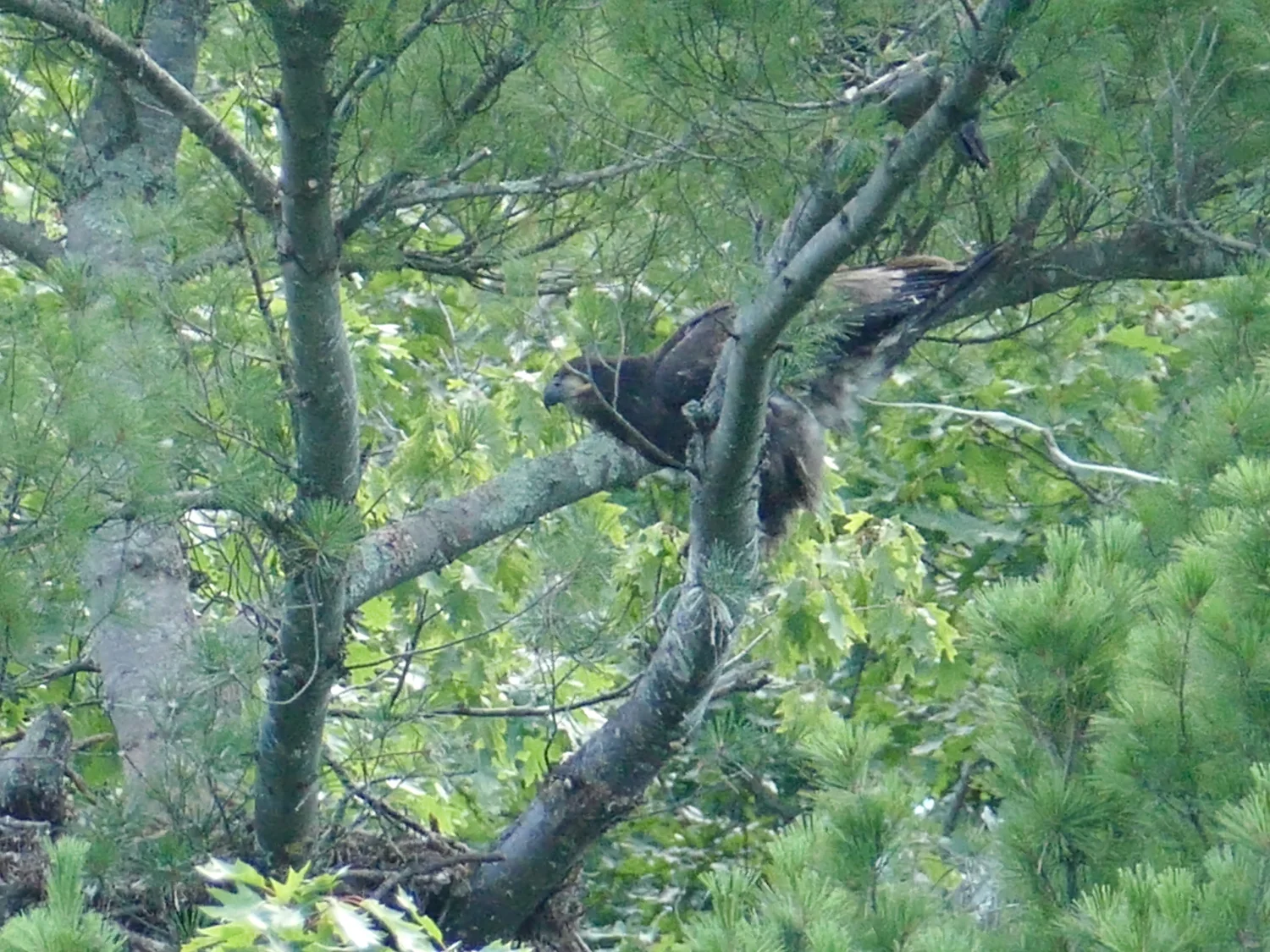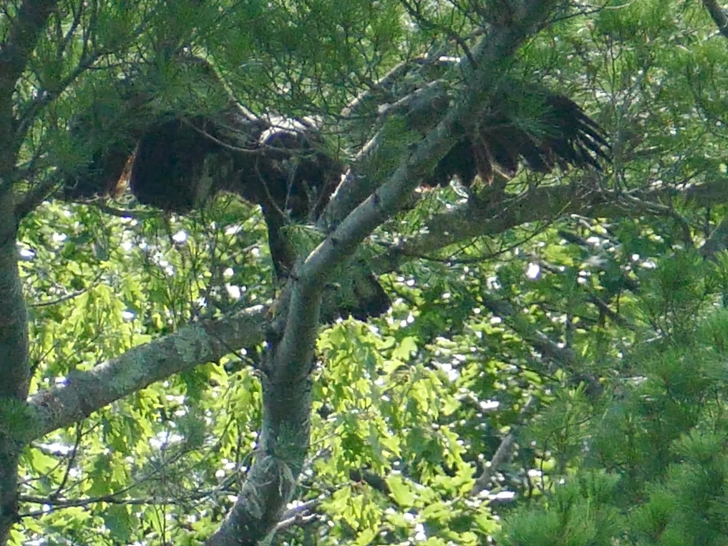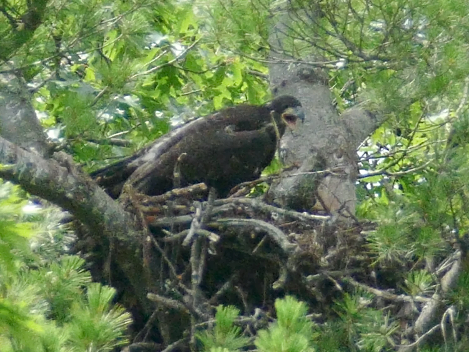 For most of the years the eagles have successfully raised one or two young eaglets. They are typically born in early spring and remain in the area until the fall. They usually fledge in July but will stay around the nest still dependent on food from the parents. Oddly, the parents do not hang around the nest except when sitting on the eggs or making a food drop once the eaglets hatch. As noted above, we rarely see them hunting on our lake and we do see them flying in from somewhere else with a fish in their talons, presumably from some other lake. Once the eaglets hatch, then we see a lot more of the parents as the eaglets are usually very hungry and vocal so it’s hard to miss them.