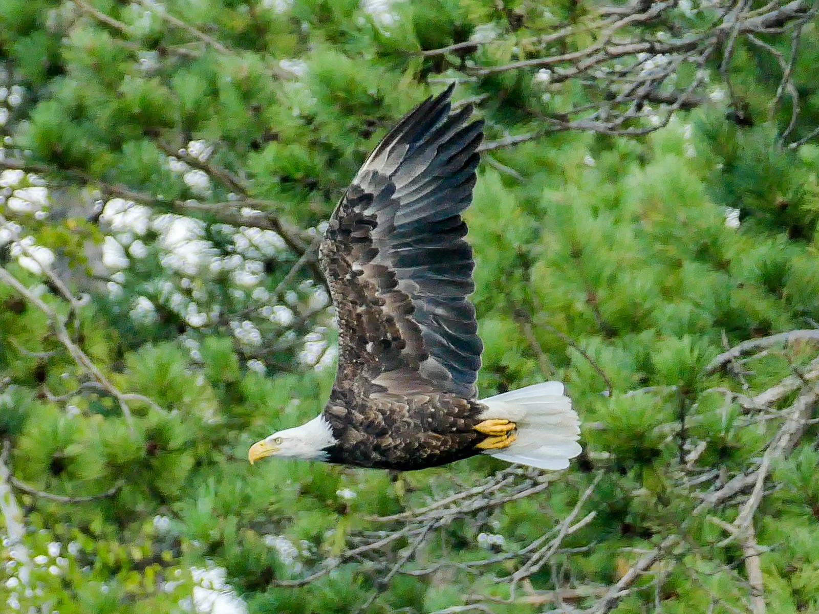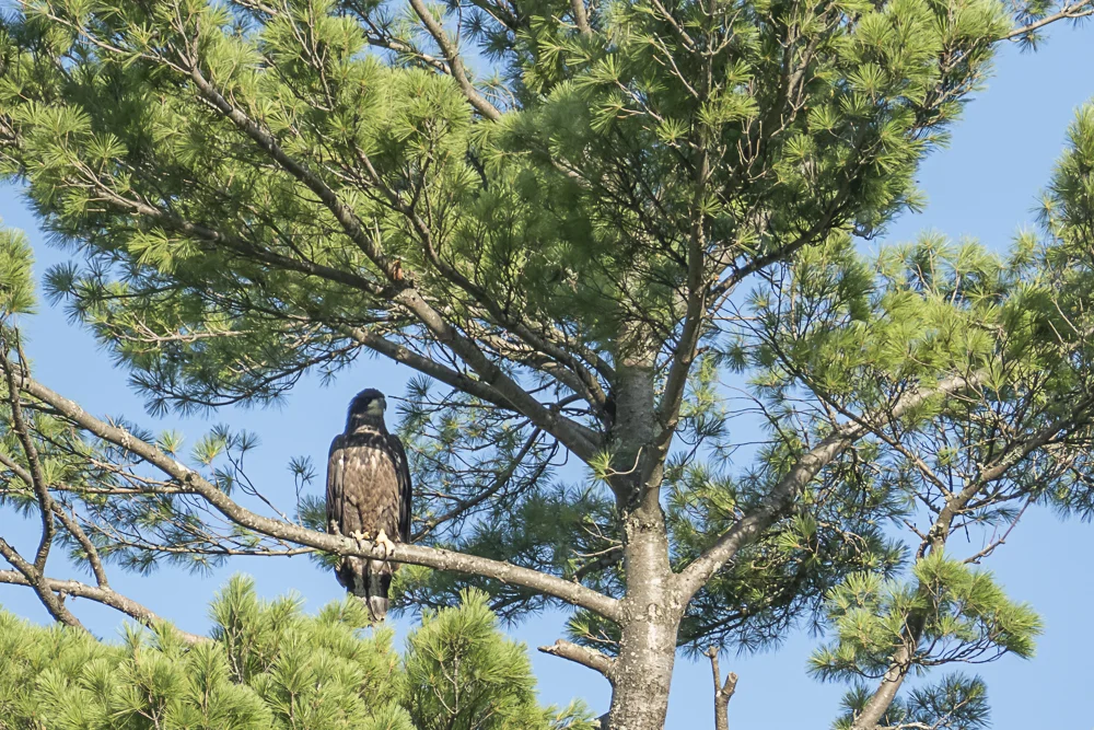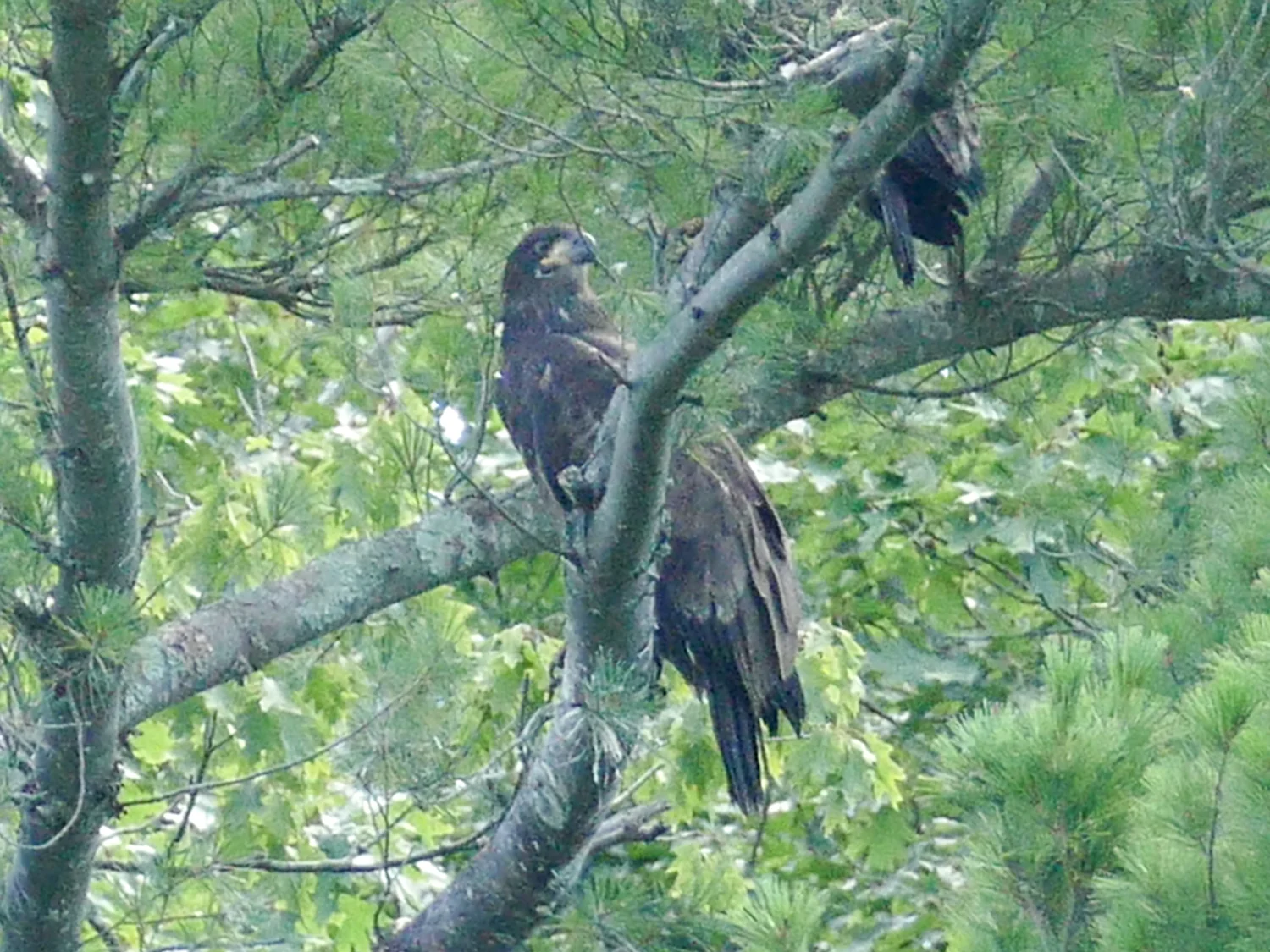 For most of the years the eagles have successfully raised one or two young eaglets. They are typically born in early spring and remain in the area until the fall. They usually fledge in July but will stay around the nest still dependent on food from the parents. Oddly, the parents do not hang around the nest except when sitting on the eggs or making a food drop once the eaglets hatch. As noted above, we rarely see them hunting on our lake and we do see them flying in from somewhere else with a fish in their talons, presumably from some other lake. Once the eaglets hatch, then we see a lot more of the parents as the eaglets are usually very hungry and vocal so it’s hard to miss them.