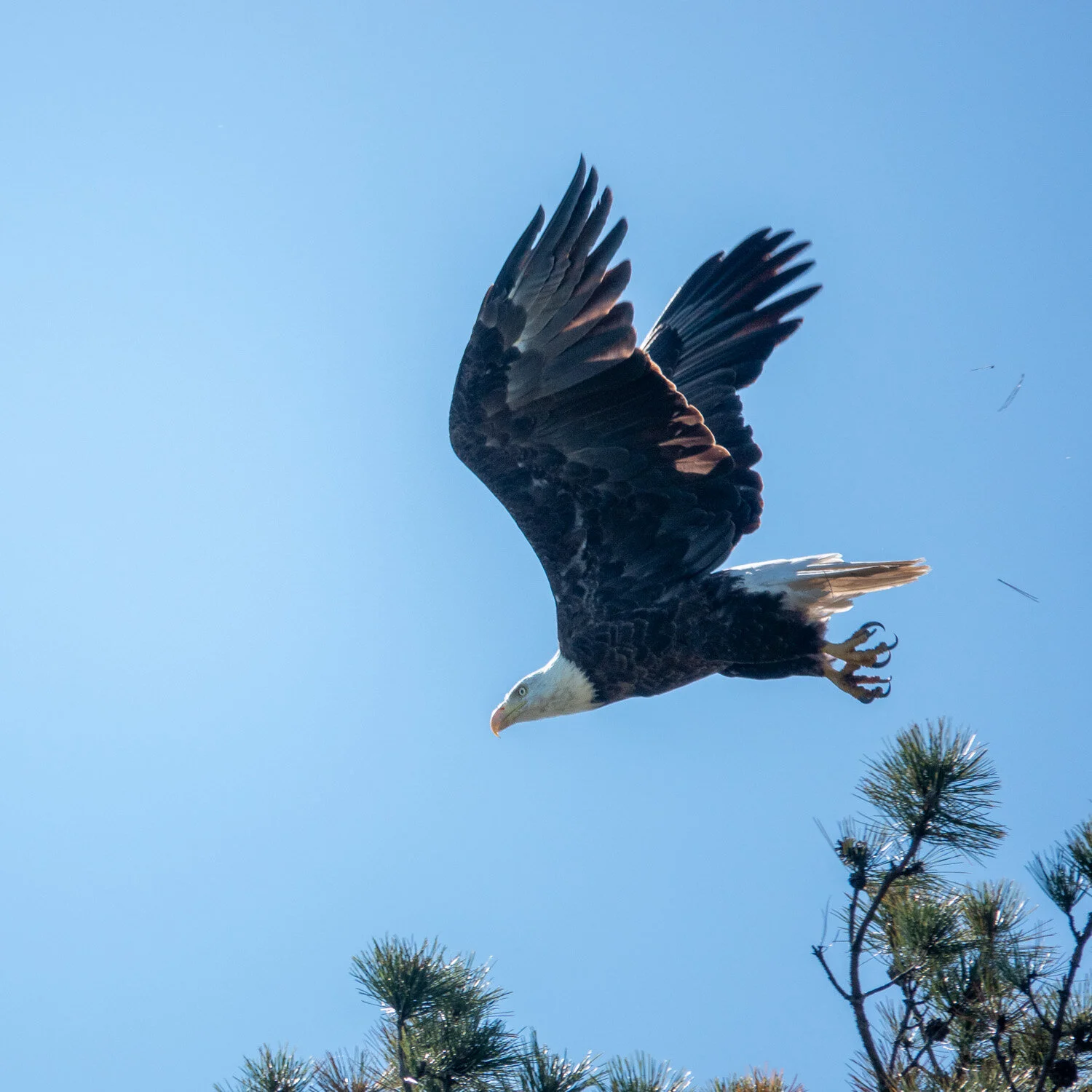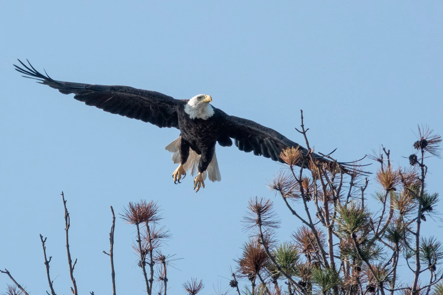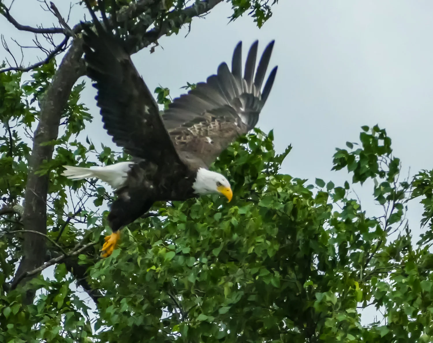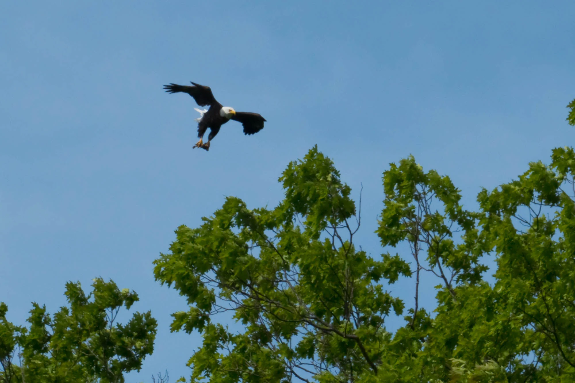 In 2019 we had a very similar experience. This time the eaglet had fledged for several weeks but it was waiting from the same branch on our island. We waited in the pontoon boat for almost 2 hours before catching this sequence of it flying off its perch in the golden light of sunset..