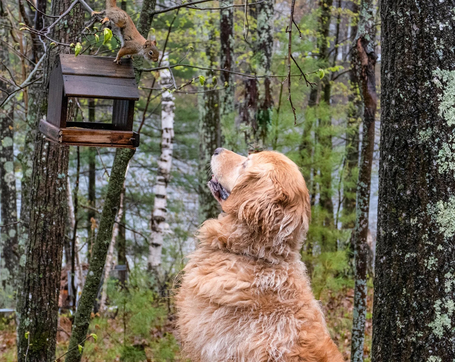 Face to face with a cheeky red squirrel who is raiding the bird feeder