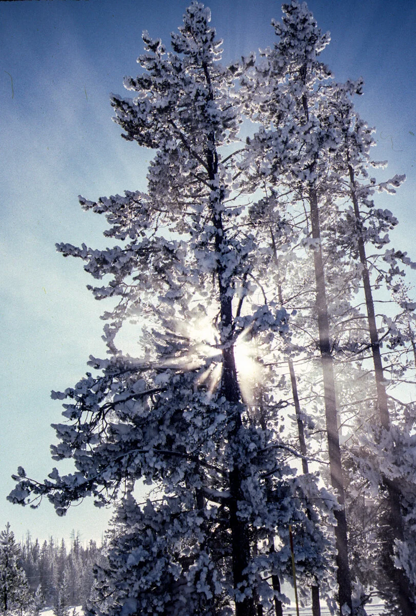 In January, 1995 we flew out to Jackson Hole, WY to spend a week in Yellowstone National Park in mid-winter. This was a wonderful trip as the park is magical in the winter with very few visitors and easy access to the iconic Yellowstone wildlife. As we expected and hoped, there was a lot of snow on the ground and it continued to come down in the days that we were there. In those days the only way into the central region of the park, near Old Faithful, was to reserve a seat on the snowcoach, which was a cross between a small bus and a snowmobile. At that time private snowmobiles were not allowed in the park, which unfortunately is no longer true. We boarded the bus at the southern end of the park and rode to the Old Faithful Lodge where we had booked a room. The main activity during the day was to cross-country ski around the basin as well as along nice trails in the woods.