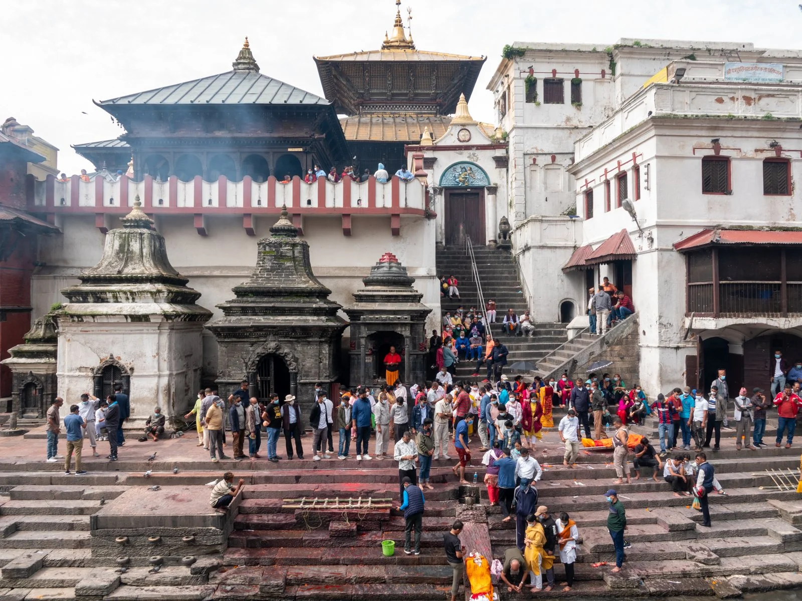 Panorama vies of the Pashupatinath Temple complex. The smoke on the left is the site of funeral cremations along Bagmati River